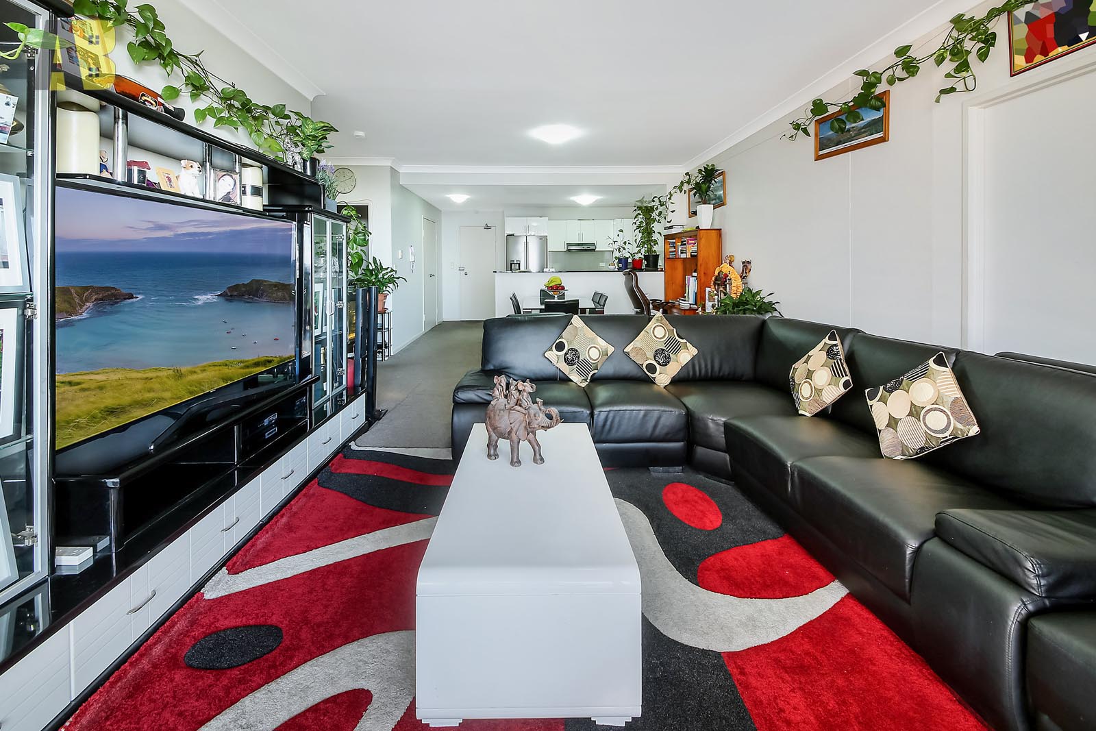 • Modern open plan kitchen with gas cooking, stone bench top, including dishwasher and extra cupboard spaces.