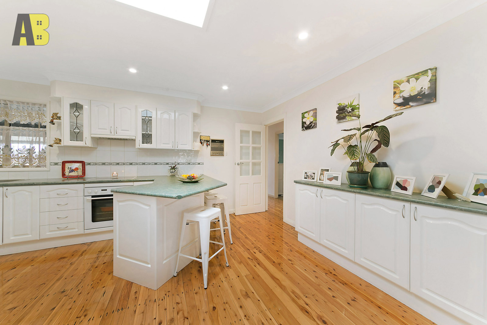 • Modern Kitchen with ceiling skylight equipped with breakfast bar, dishwasher and plenty of storage area