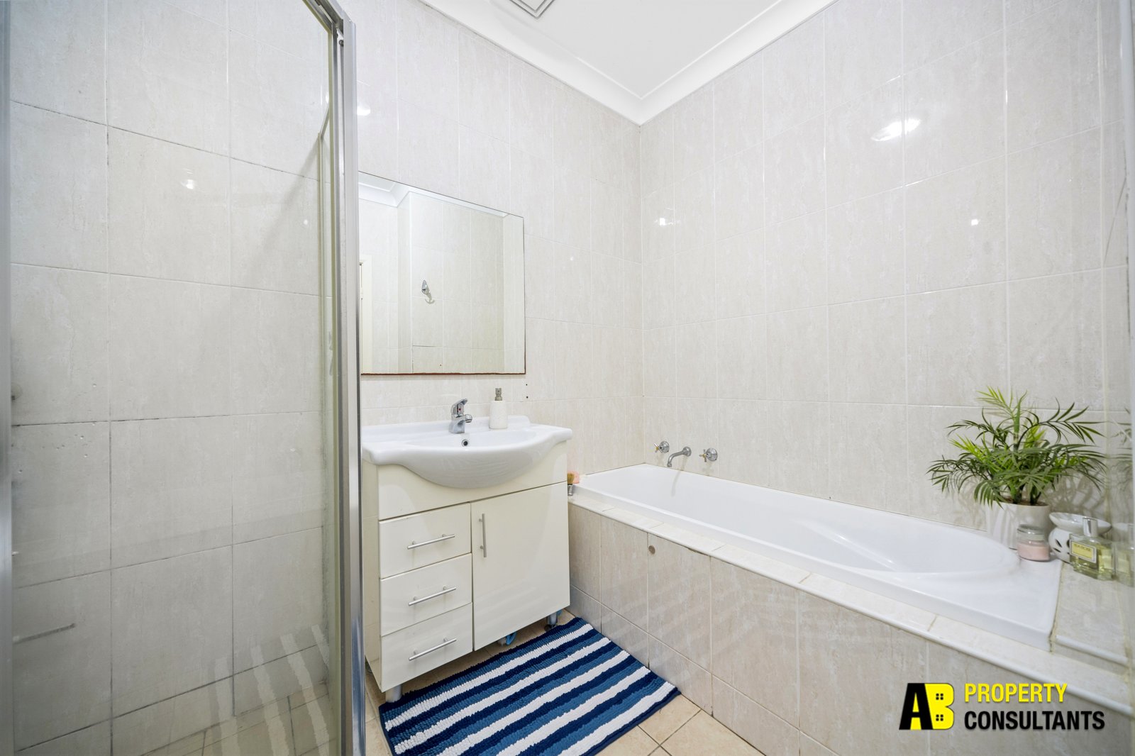 • Contemporary fully tiled second bathroom with a bathtub