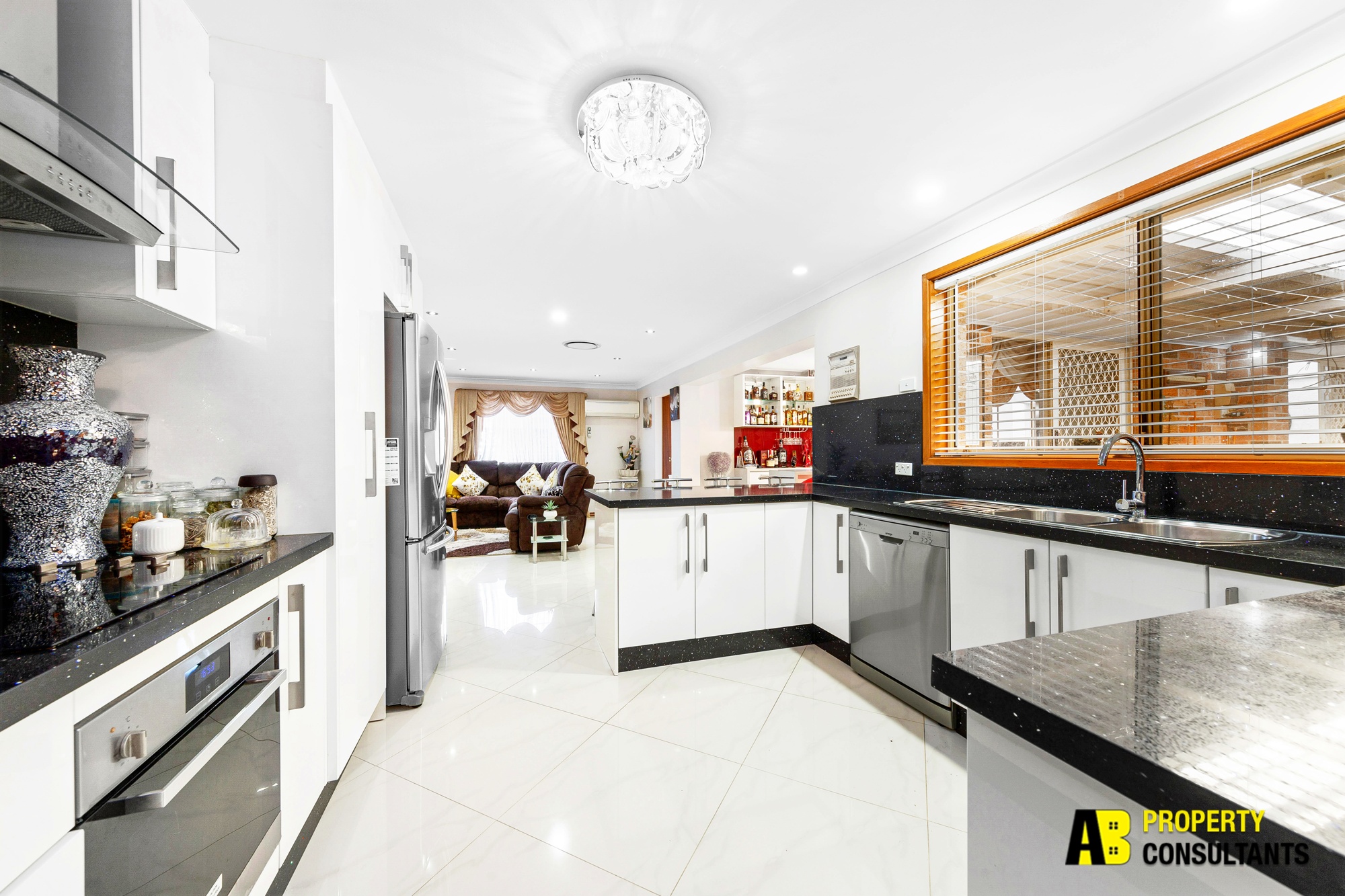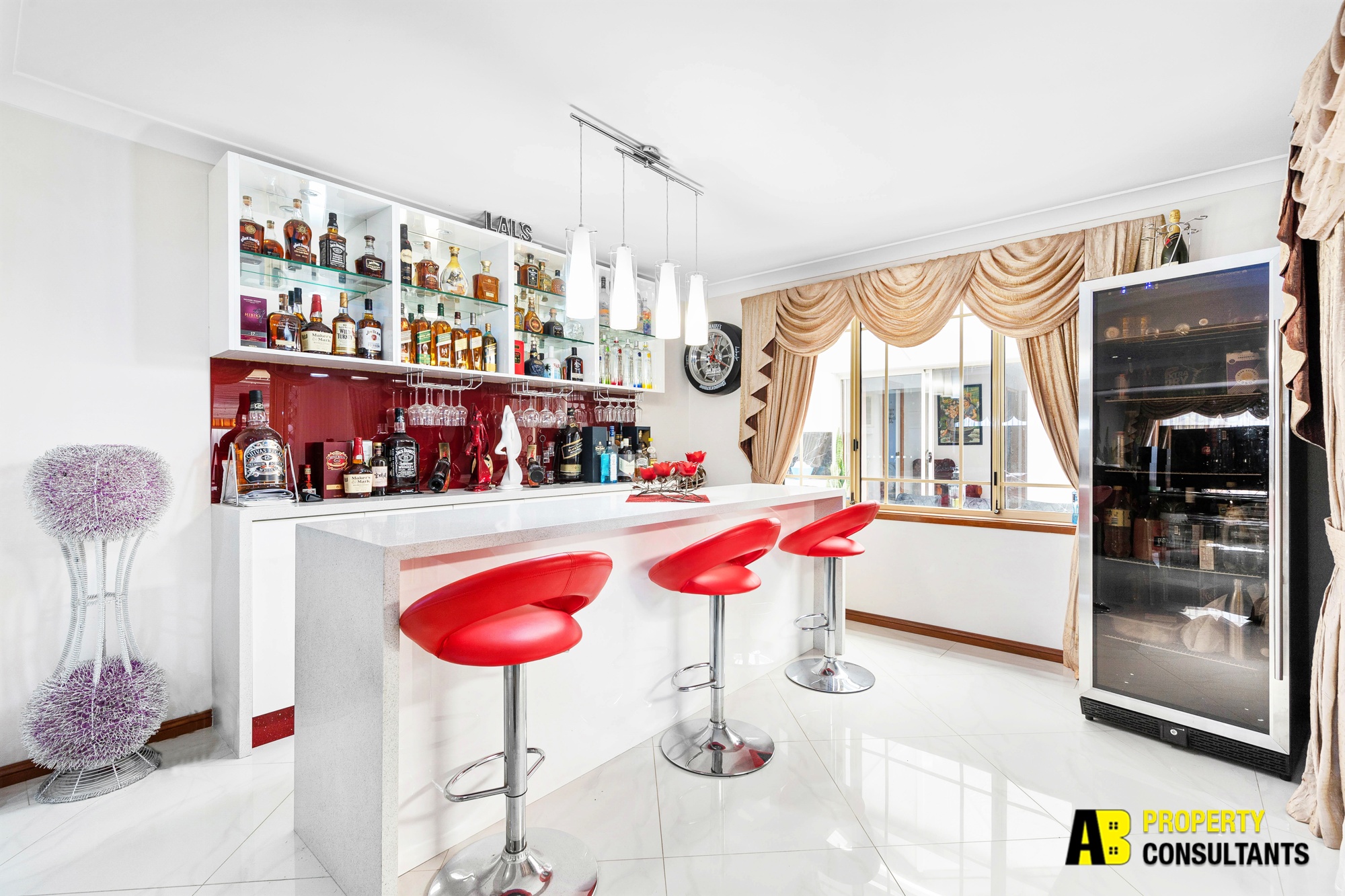 + Open family area with lavish bar room with CaesarStone waterfall island bench and seating for five masses of versatile space for the entire family to spread out and relax