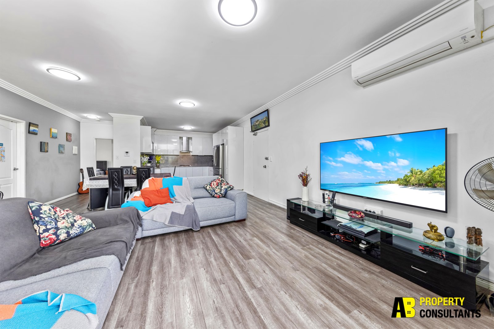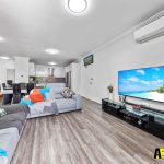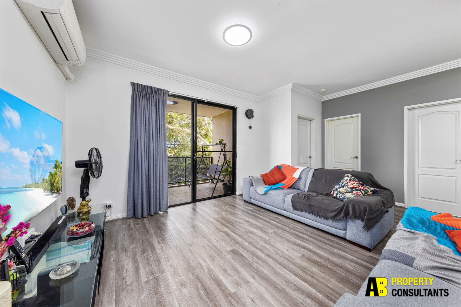 – Open plan oversized living room with reverse cycle air conditioner leading out to balcony with leafy outlook