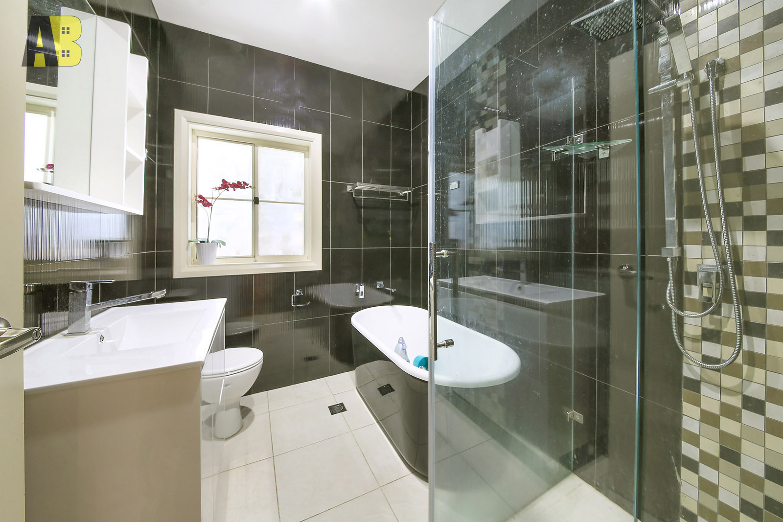 • Fully tiled modern bathroom with deep bath tub and separate shower