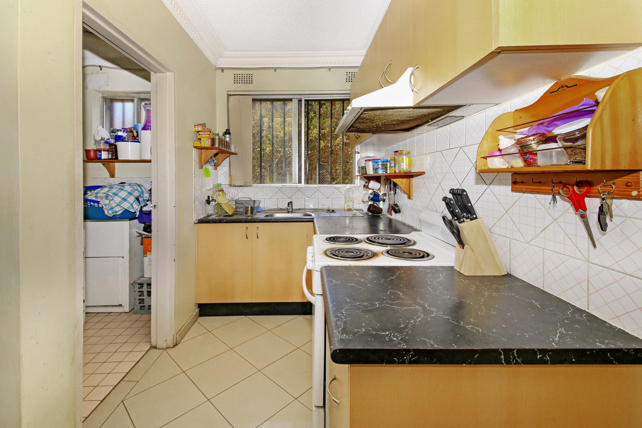 – kitchen with large pantry cupboard. Tiled dining area.