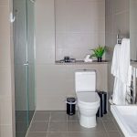 The immaculate bathroom is another standout feature of the home with shower over bath with frameless glass screen, recessed stone vanity with wall-hung basin, and wall-to-wall mirrored cabinetry.