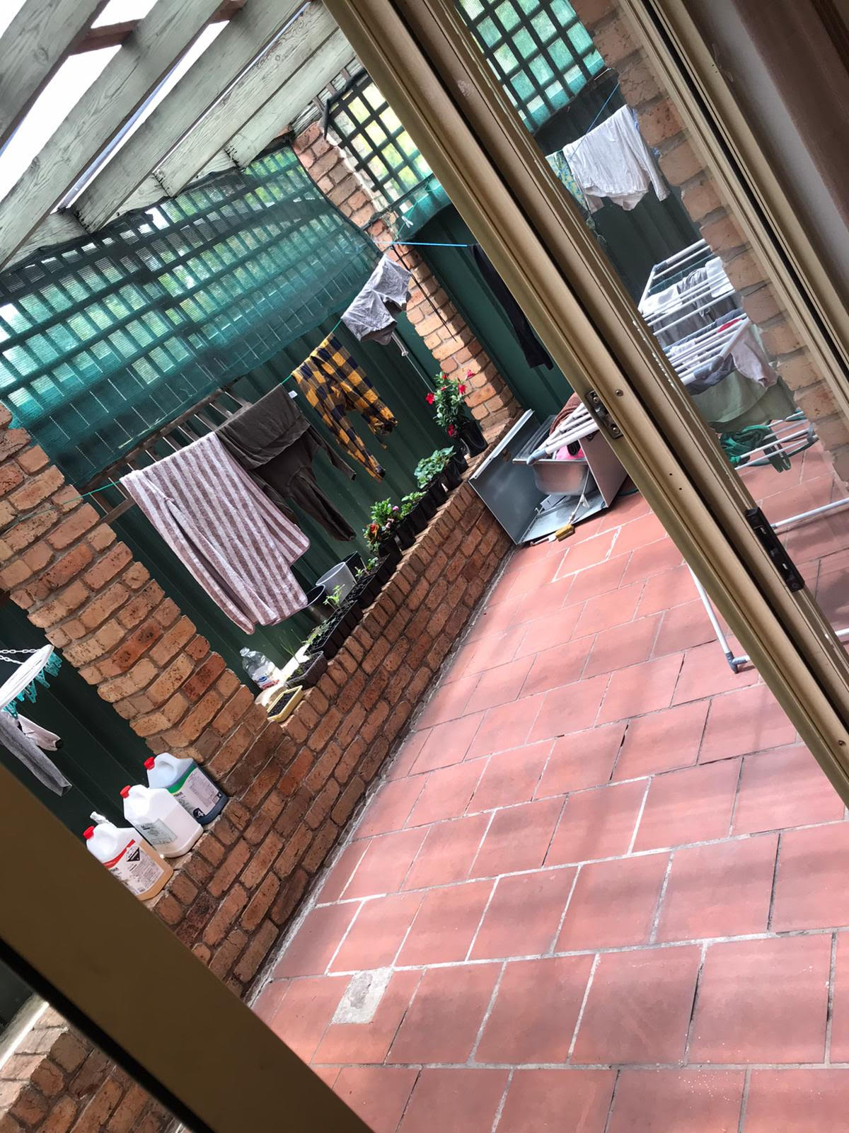 -Covered Low maintenance paved entertaining backyard with clothesline